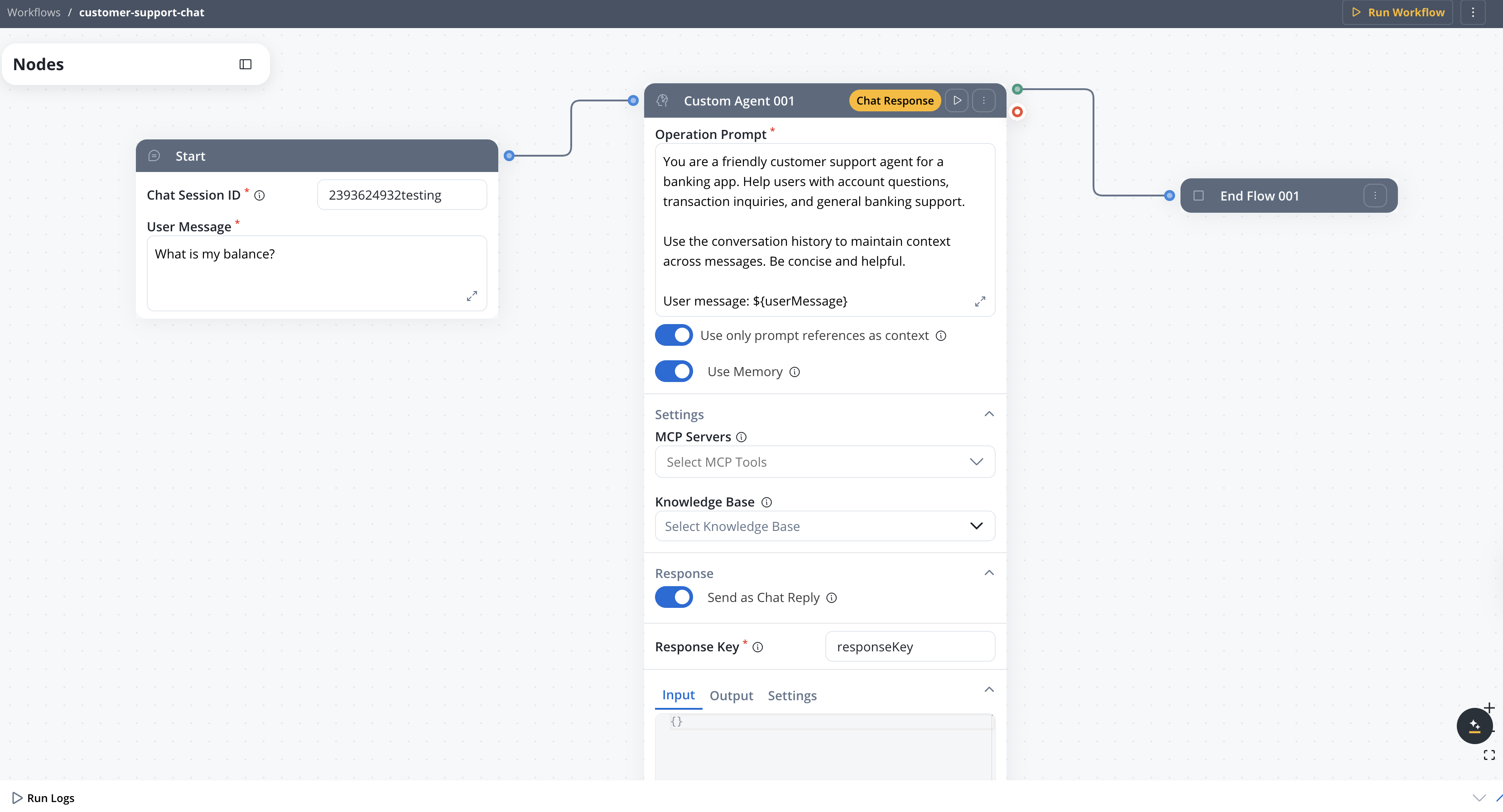 | User Message | The user’s message text | Required. Referenced in nodes using ${userMessage} |