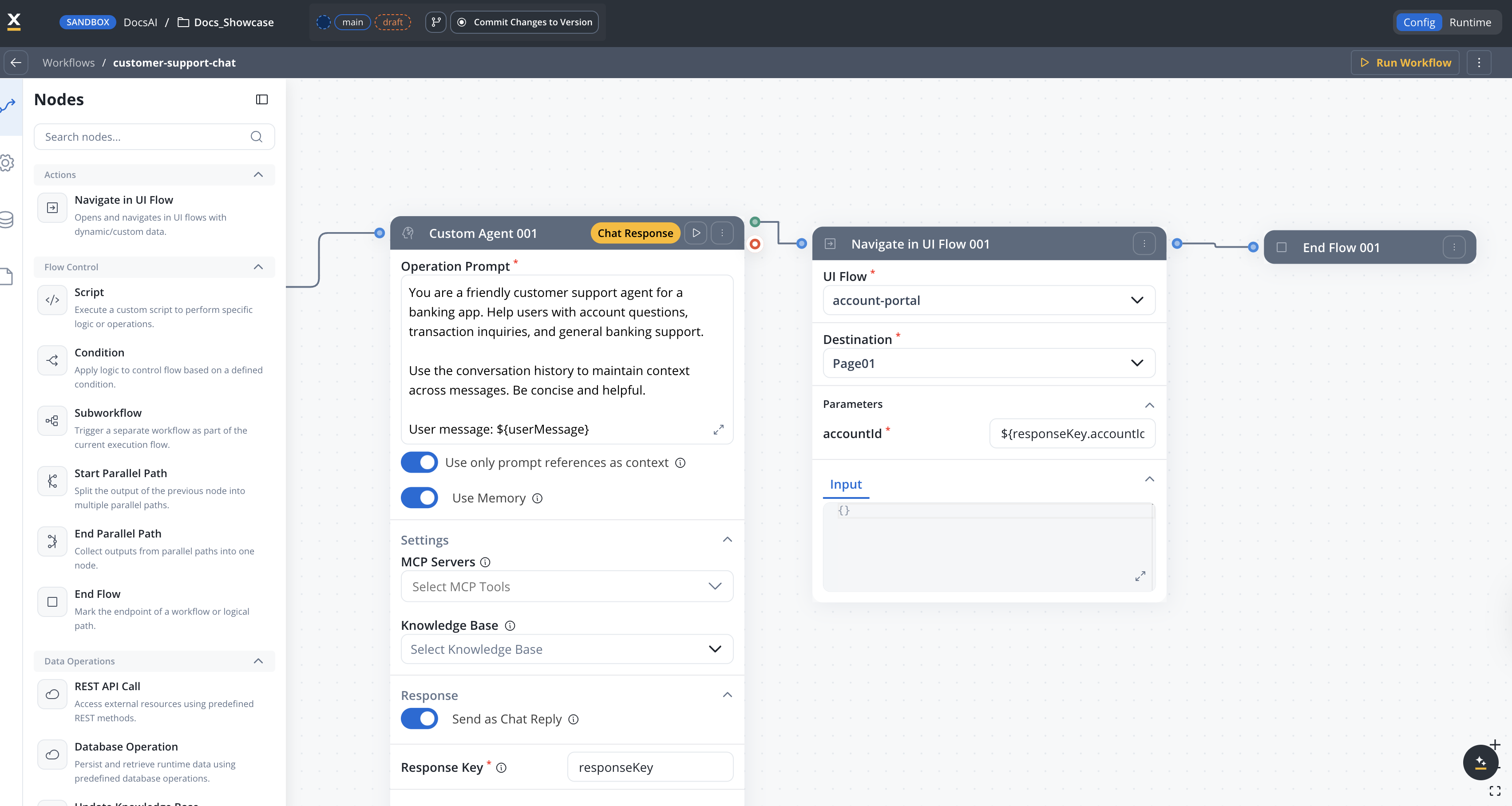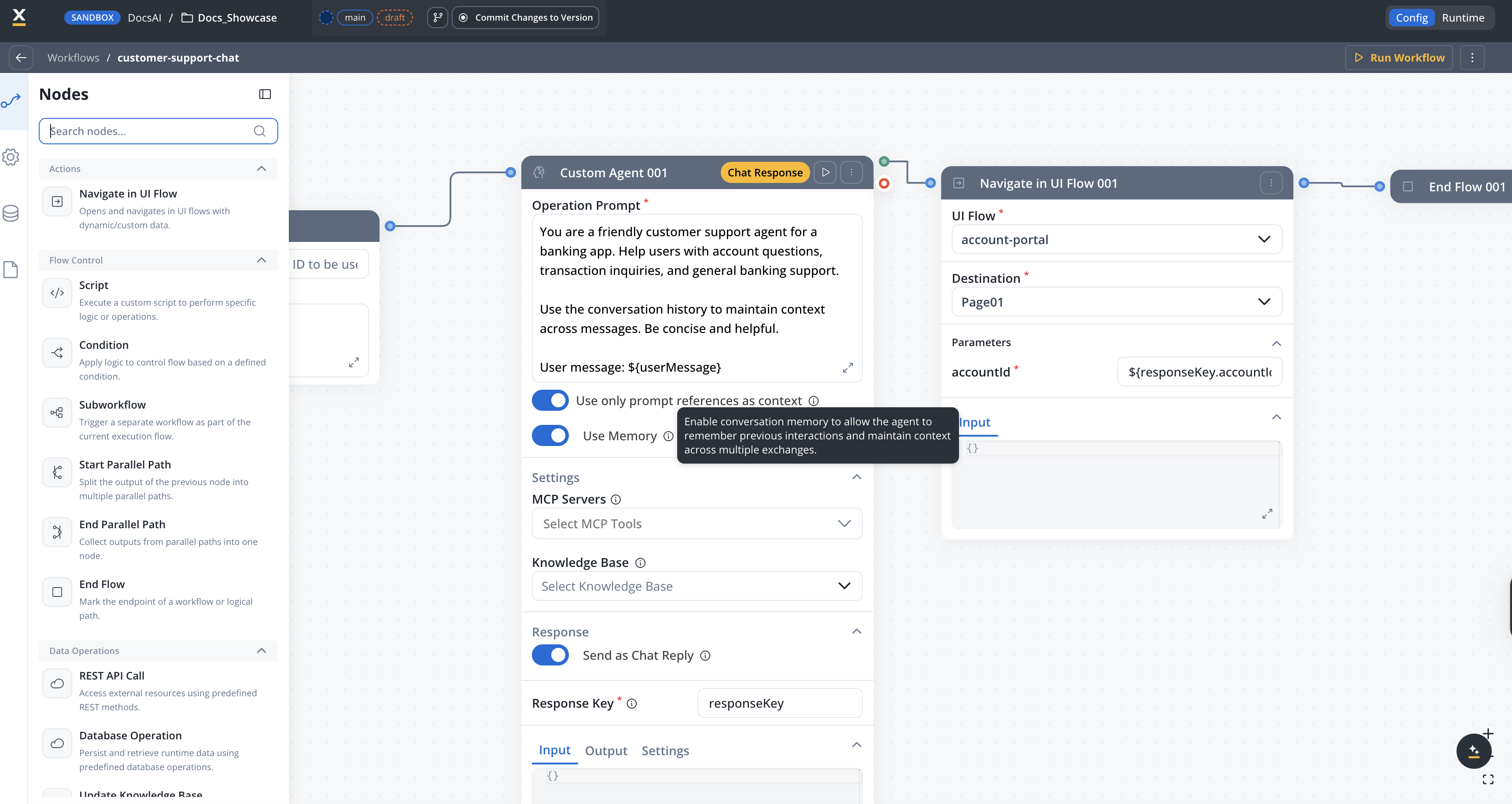 | Response delivery | Direct chat reply from Custom Agent nodes | Output on End node |