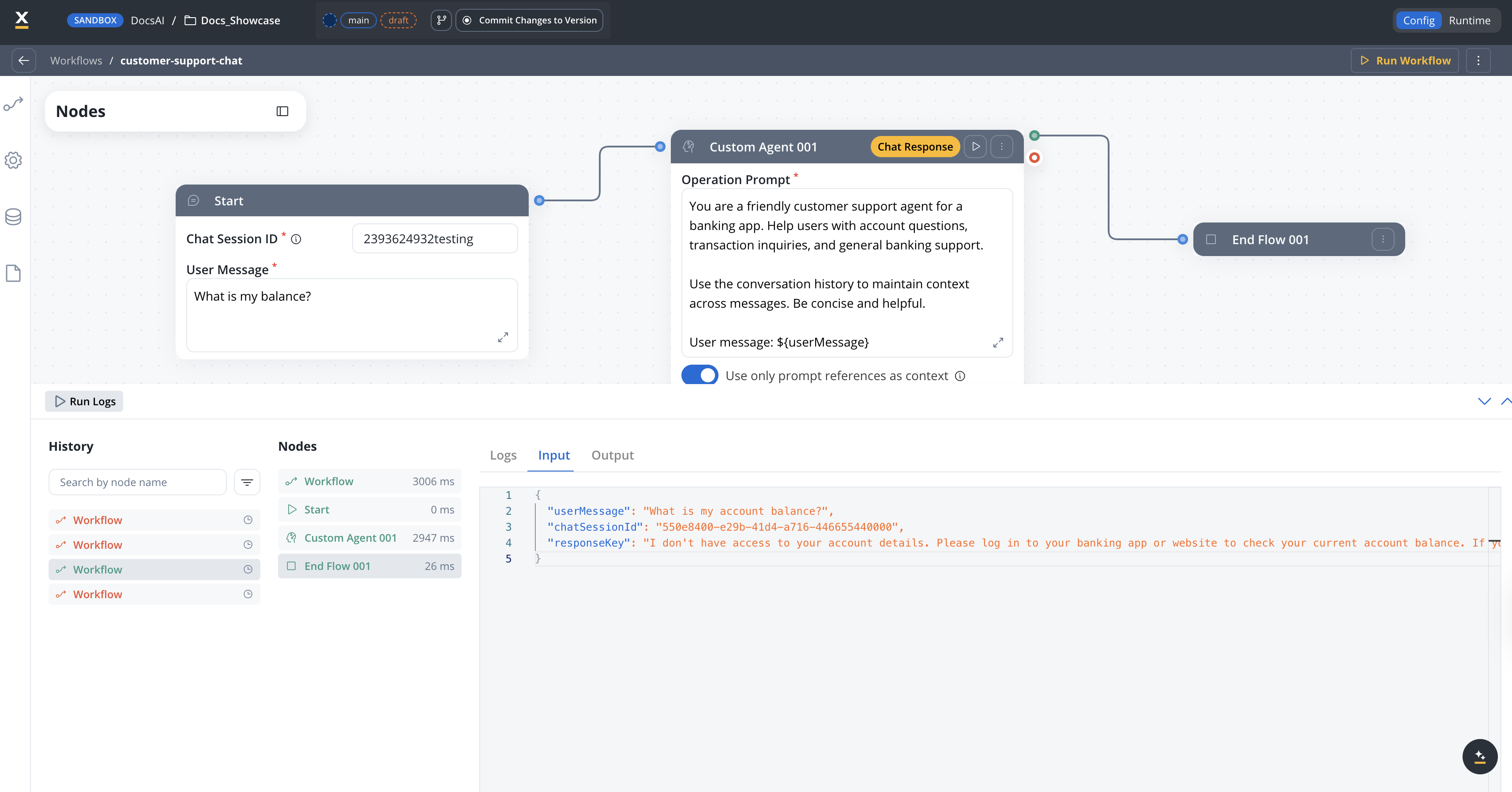 - Input tab — Displays User Message and Chat Session ID in JSON format (read-only)