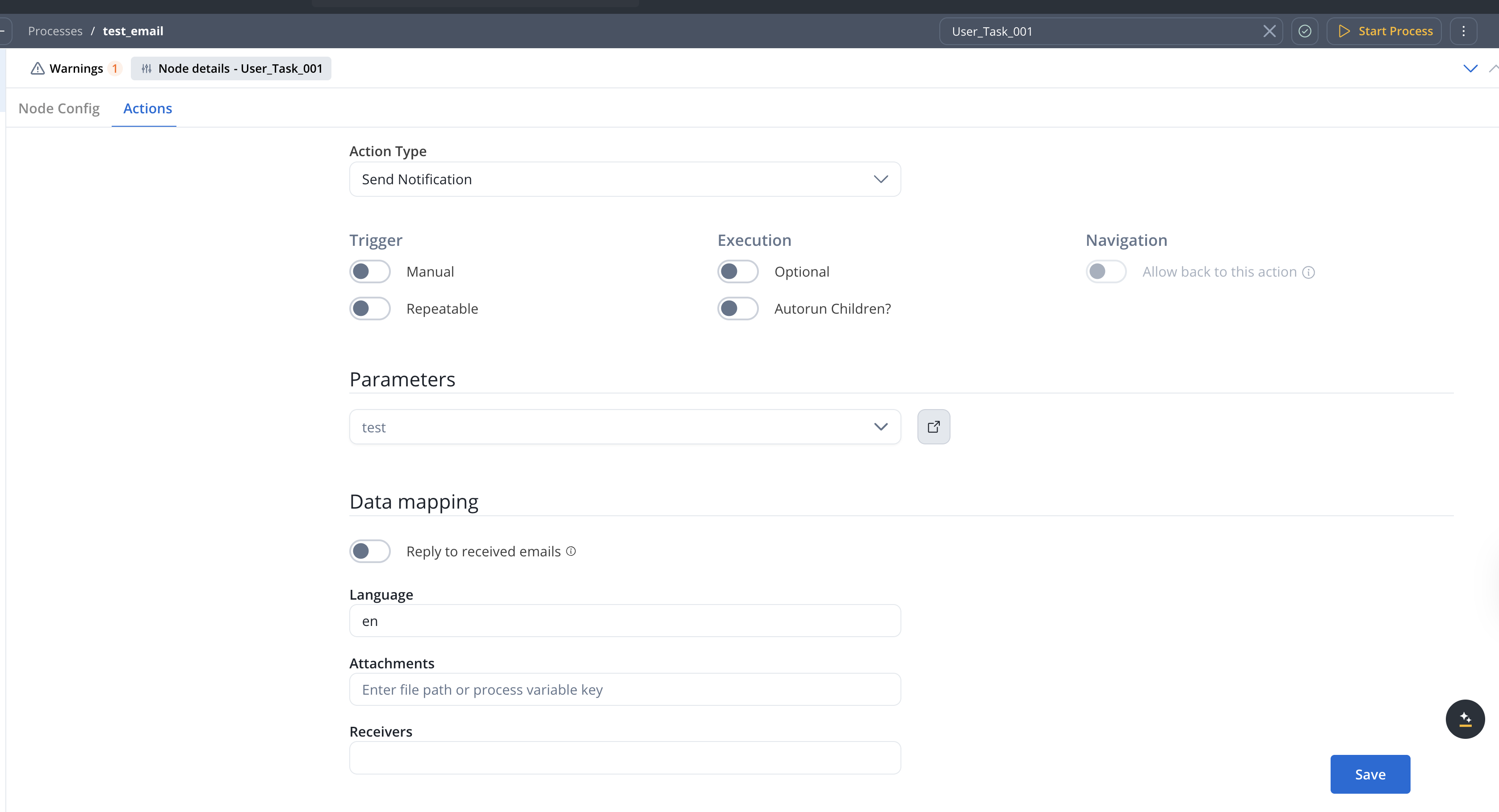 The Send Notification action enables process nodes to send emails directly through a predefined email connection. It supports two modes:- New email mode - Send a new email to specified recipients