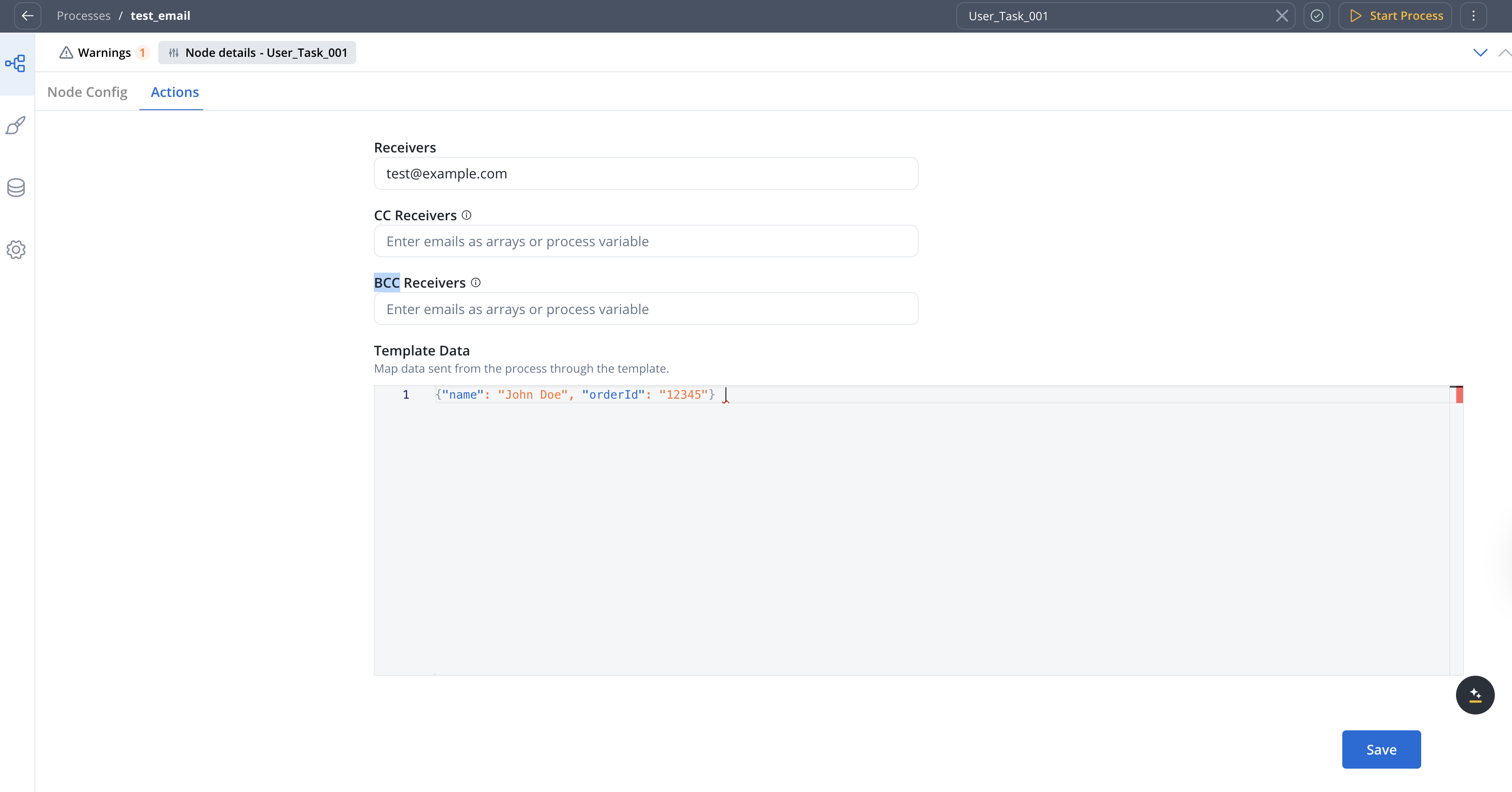 Map data sent from the process through the template. Use the JSON editor to define key-value pairs matching the data model in your notification template.
