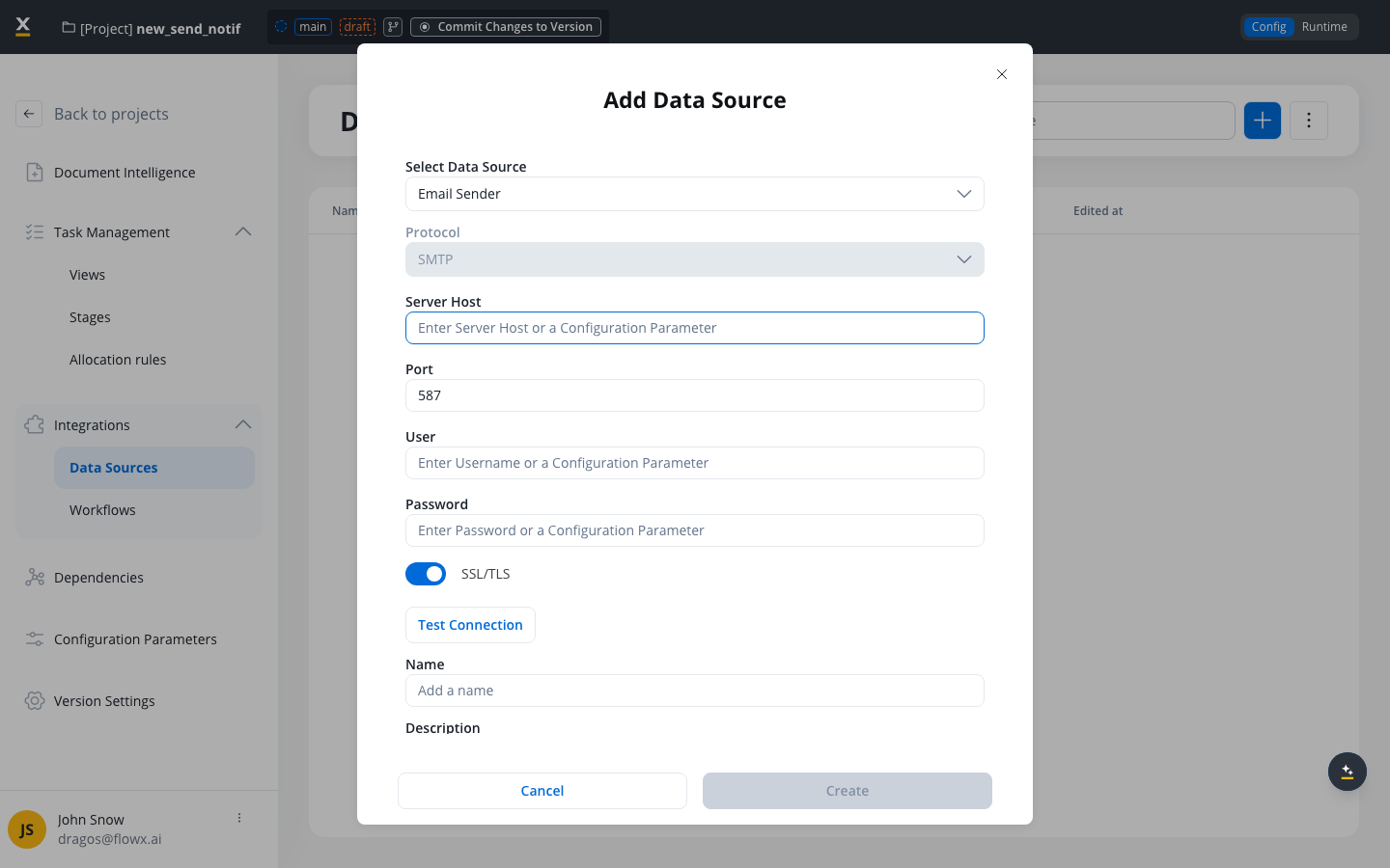 Available starting with FlowX.AI 5.5.0Email Sender is a data source type that enables processes to send emails directly through SMTP connections, without routing through Kafka.