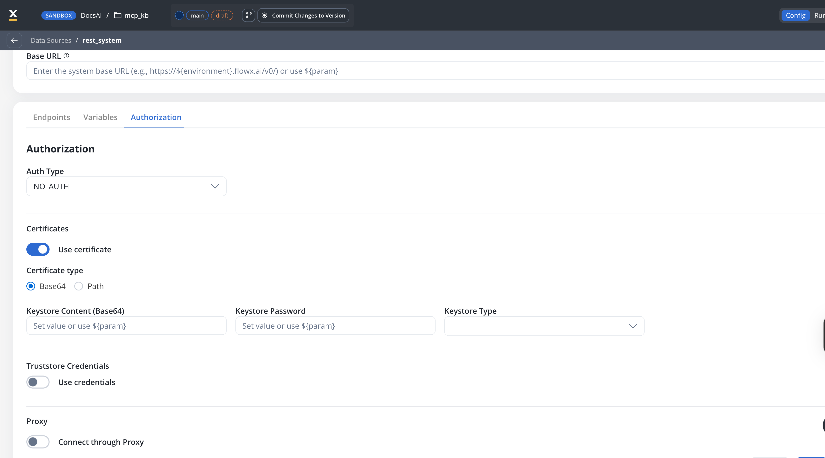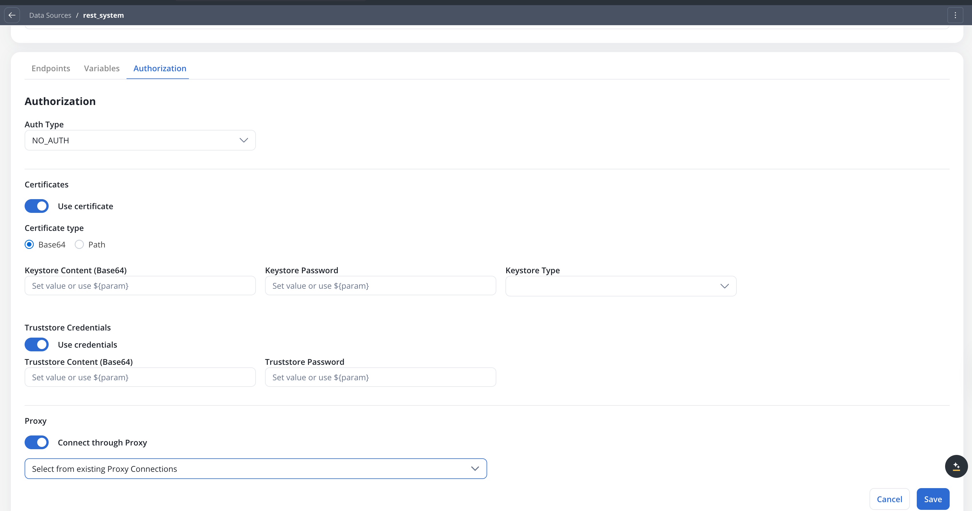 With Data Sources feature you can create, update, and organize endpoints used in API integrations. These endpoints are integral to building workflows within the Integration Designer, offering flexibility and ease of use for managing connections between systems. Endpoints can be configured, tested, and reused across multiple workflows, streamlining the integration process. Go to the Data Sources section in FlowX Designer at Workspaces -> Your workspace -> Projects -> Your project -> Integrations -> Data Sources.Data sources types